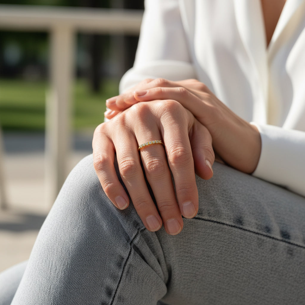 Discover our magnificent Labradorite Ring, adorned with seven round natural fine stones that form part of its perimeter. The Labradorite here presents a variation of grayish hues. Made with precision, this gold-plated silver ring combines elegance and natural beauty for an exceptional jewel.